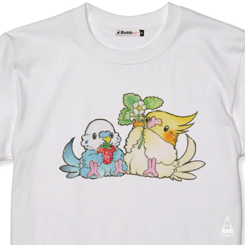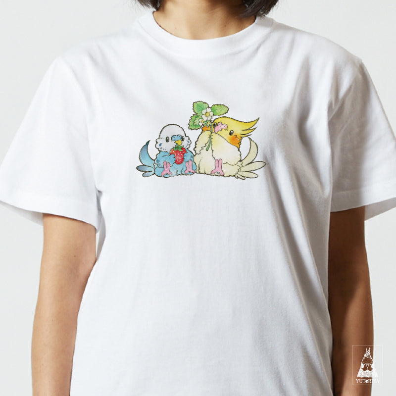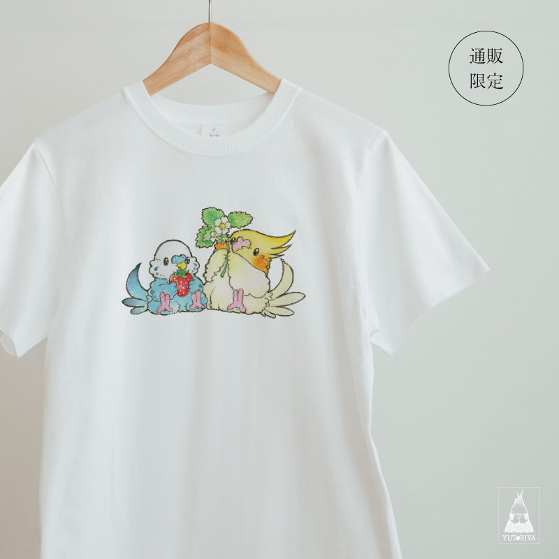 This is a super cute T-shirt featuring finches riding a bright red monkey.